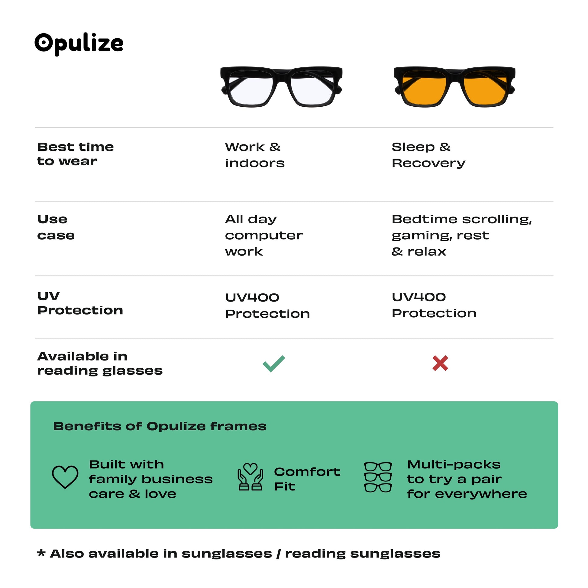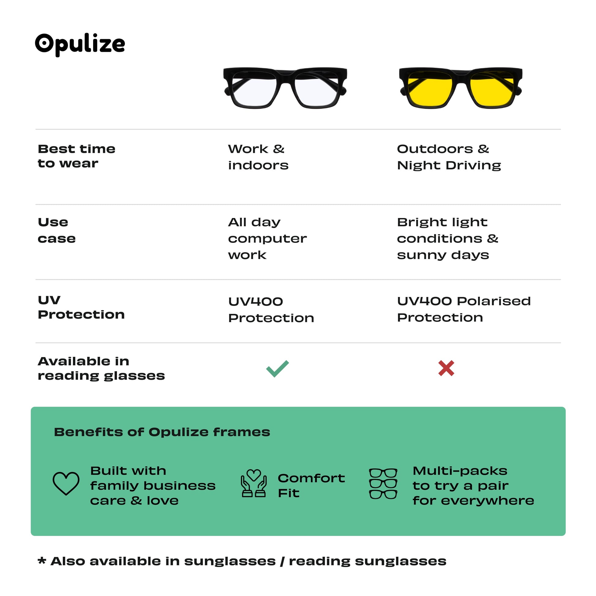 A London based, family run business since 2012, we take pride in every pair of glasses we create. Each design is meticulously crafted to combine functionality and sophistication, ensuring that you not only enjoy optimal vision but also make a statement with your style. All our glasses are affordable, comfortable and made with family business care. We make stylish frames with lenses for everybody, from blue light to reading glasses and sunglasses. And finally, we believe with our glasses you can have a pair for everywhere. A pair for the car, for the kitchen and for bed time.