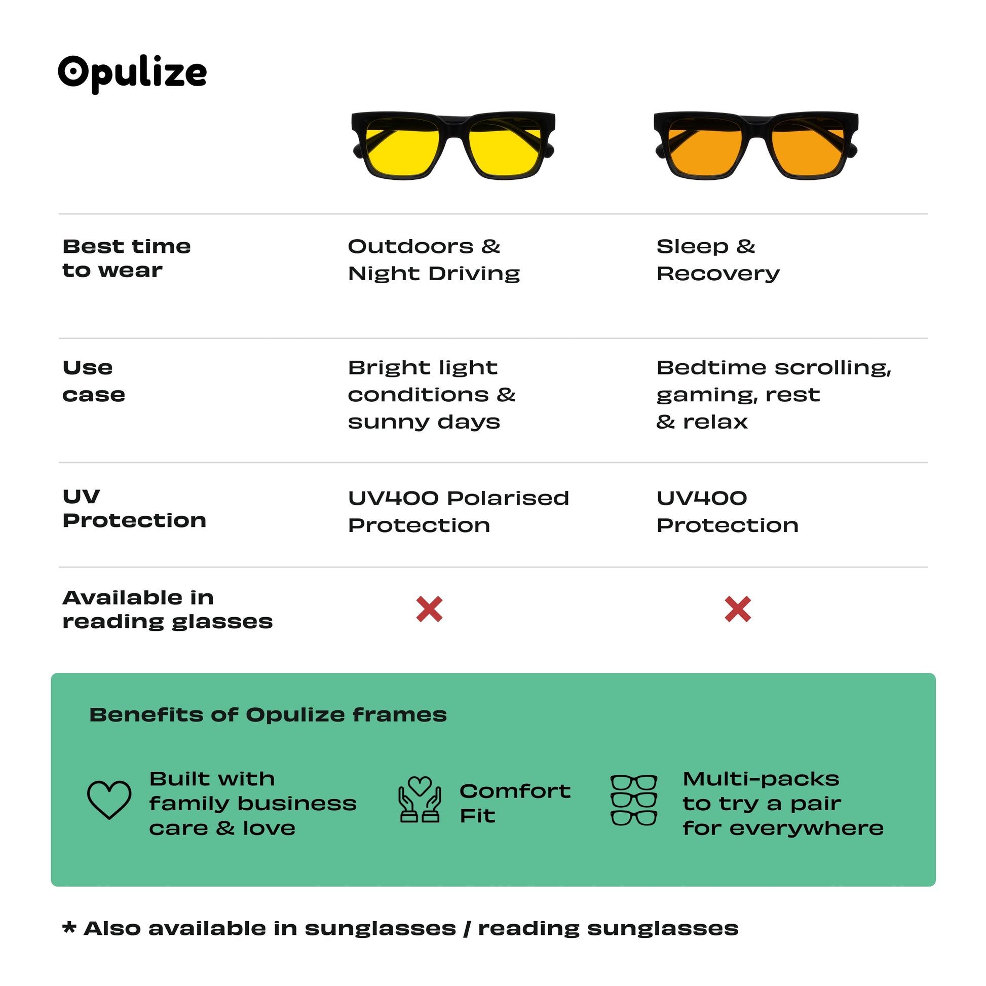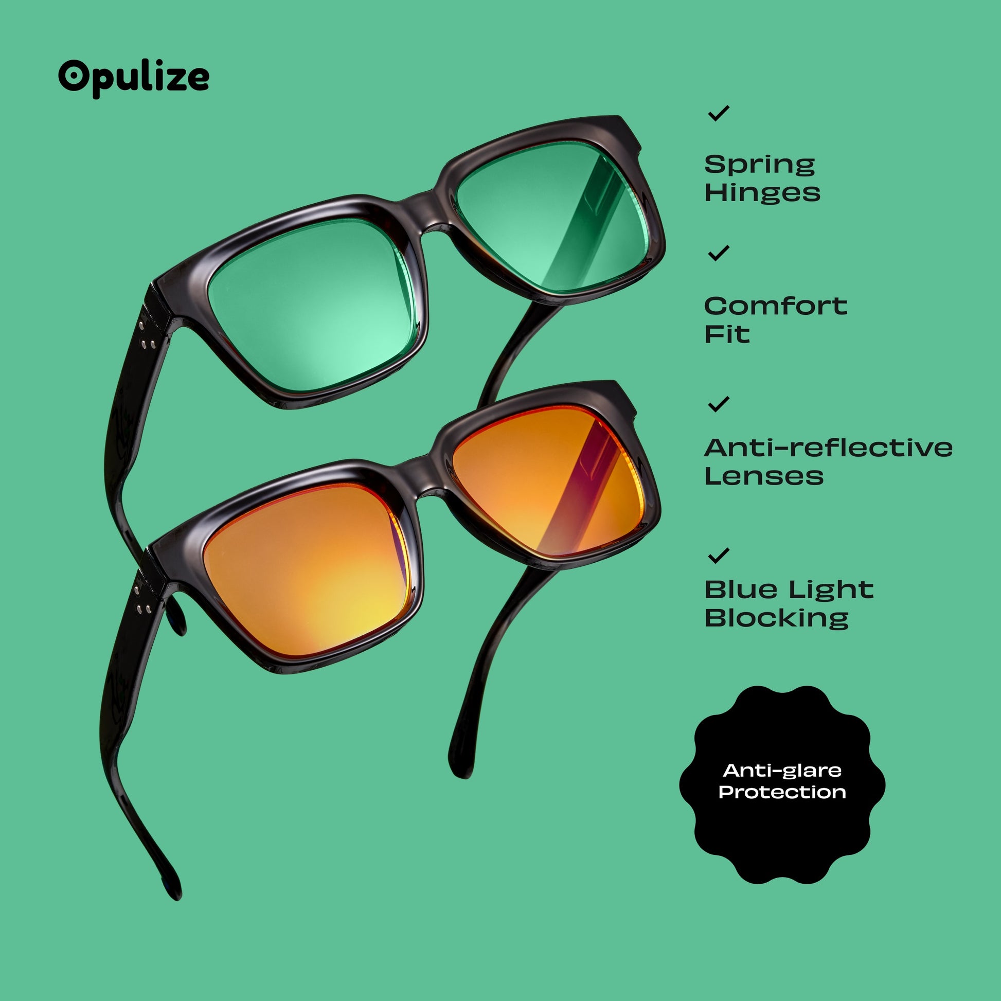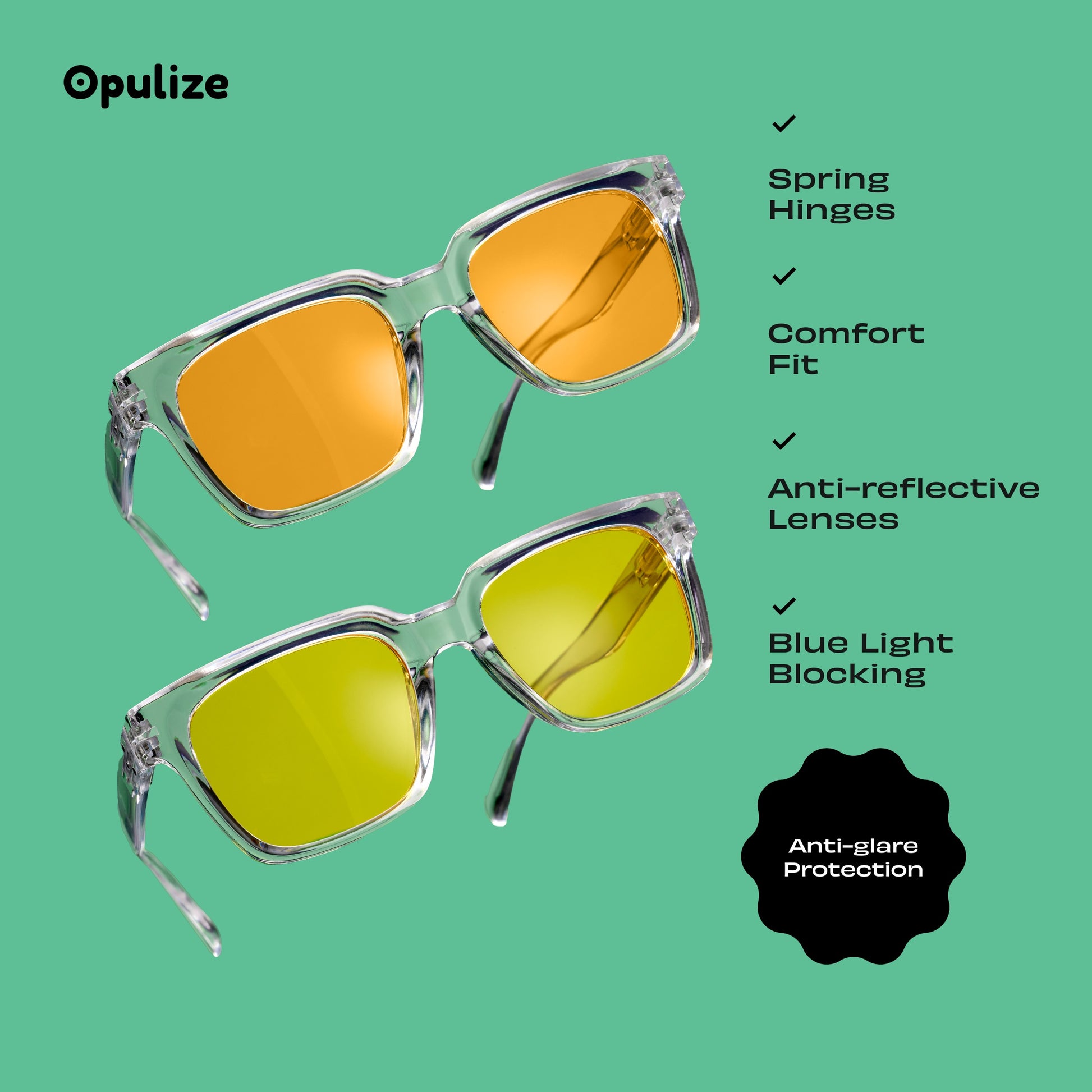 All Anti-reflective Lenses Blue Light Protection Orange Lens: 99.9% Blue Light Lens Yellow Lens: Polarised Lenses Spring Hinges |