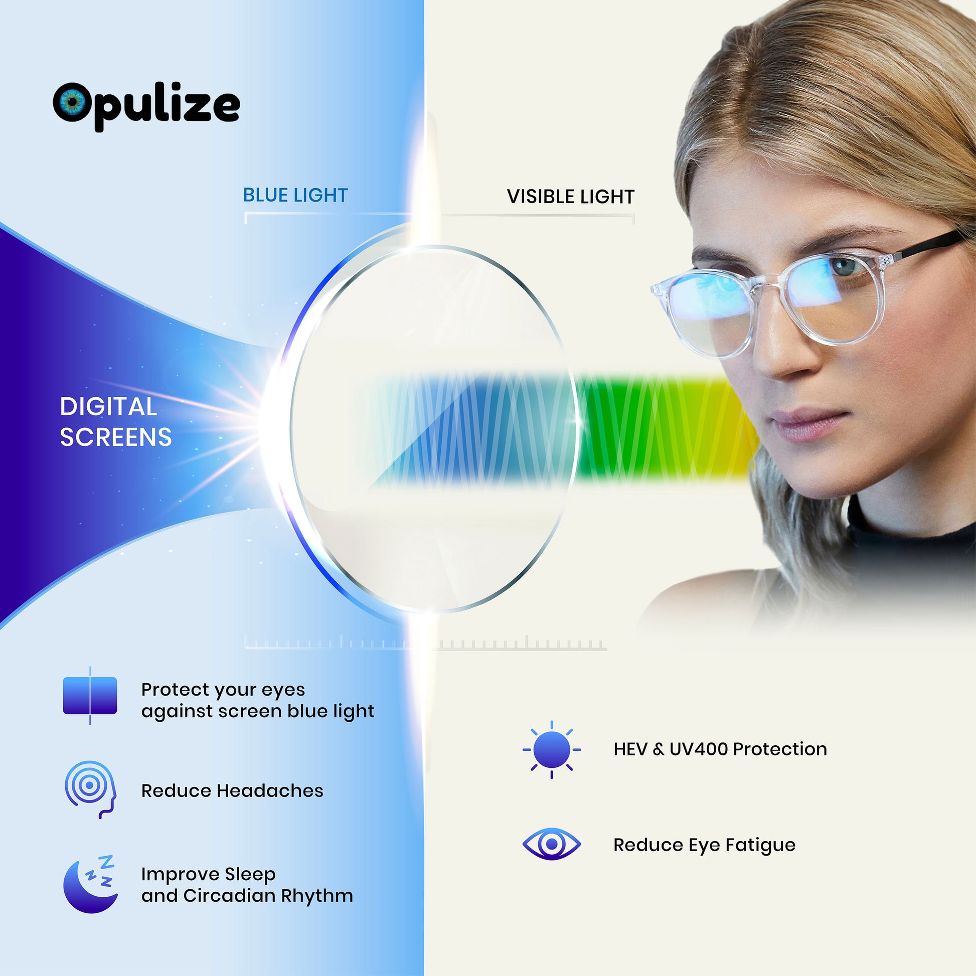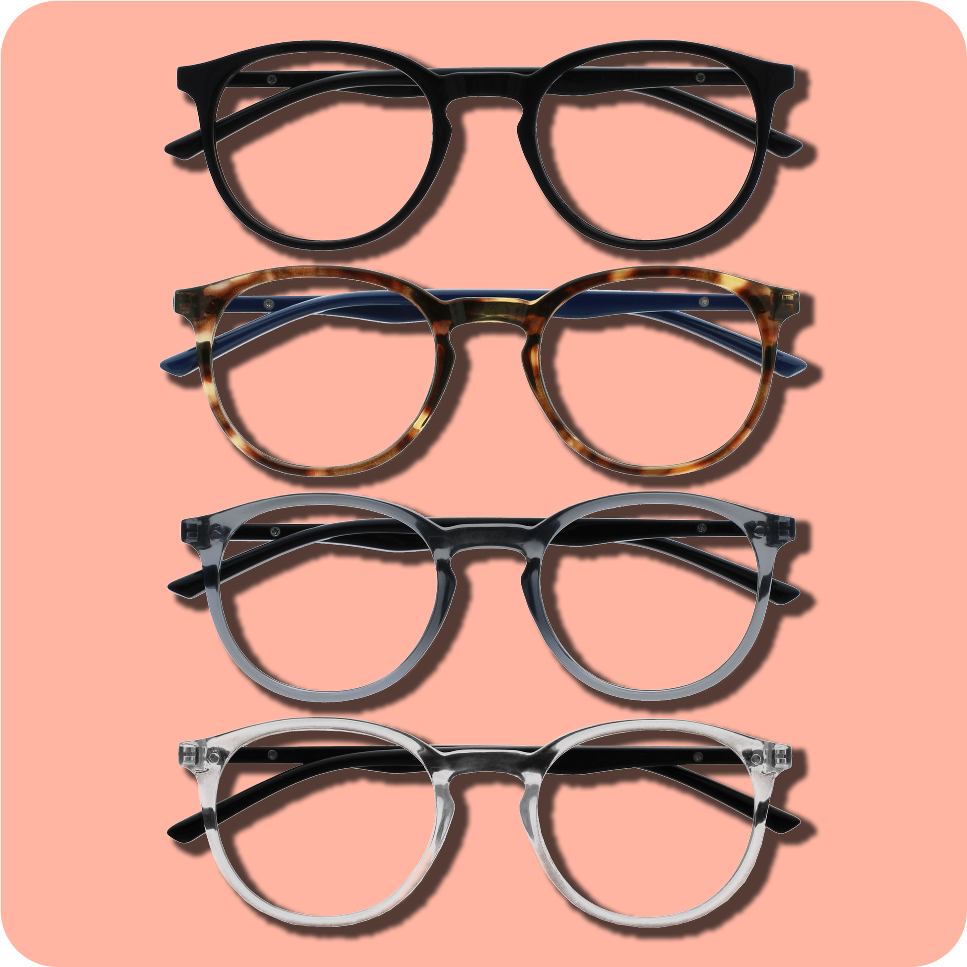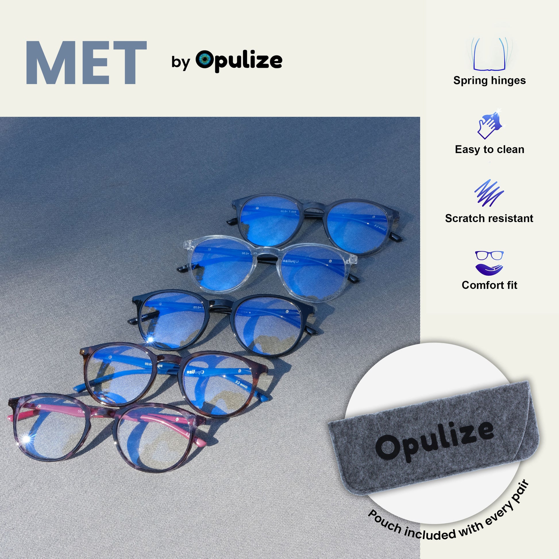 Extra value packs mean big bold looks, small prices. Meet MET. Different all round. Having trouble sleeping? Scrolling all day? Opulize zero prescription, blue light glasses mean sharper focus, and less strain. By blocking the blue light emitted from your phone, laptop or tv, you can give your eyes the break they need. Especially before bed. This popular stylish thin round frame comes in 5 great colours. Finished with a contrast arm and elegant metal detail. MET has scratch-resistant lenses, spring hinges for extra comfort and come with our Opulize felt pouch. MET are your secret weapon against screens.