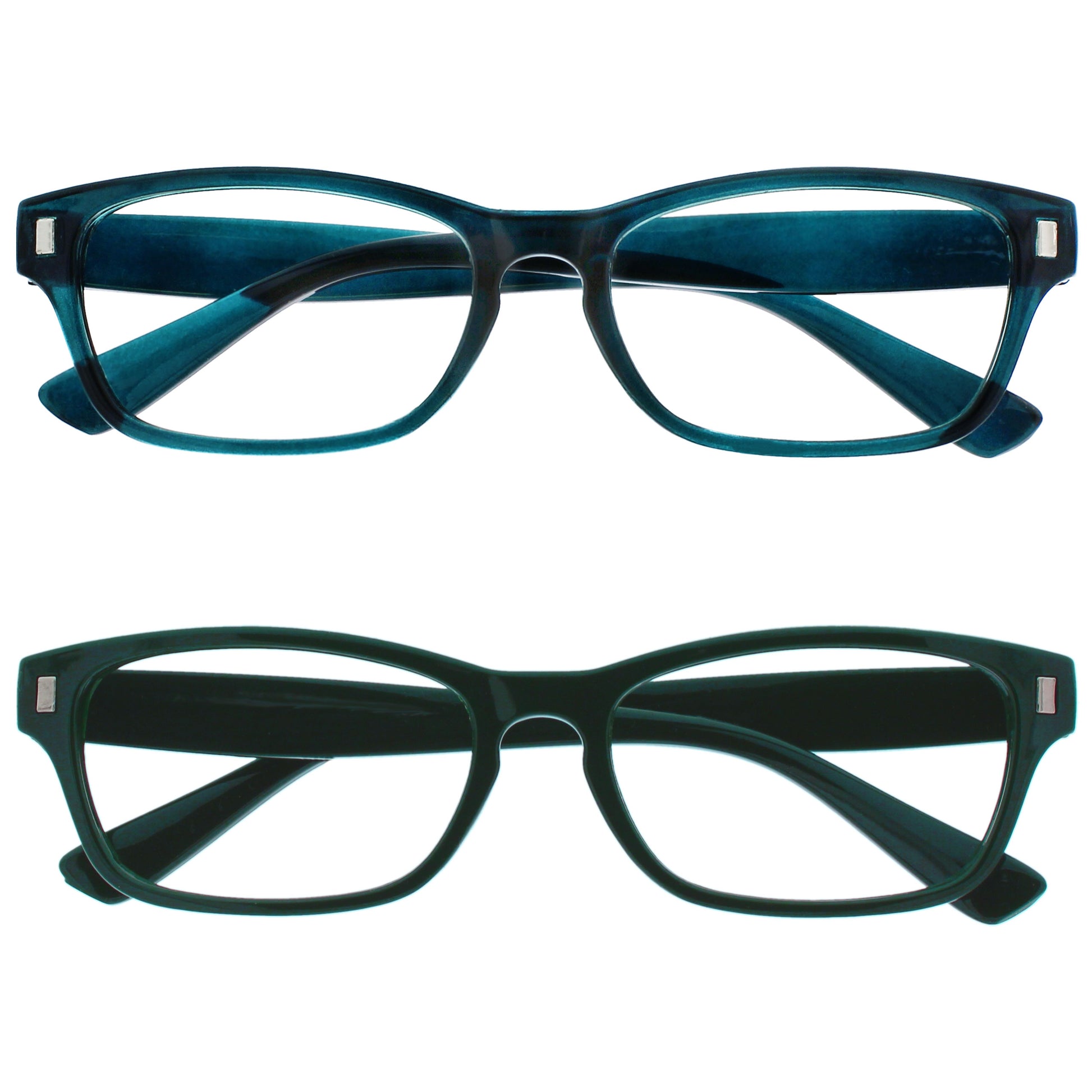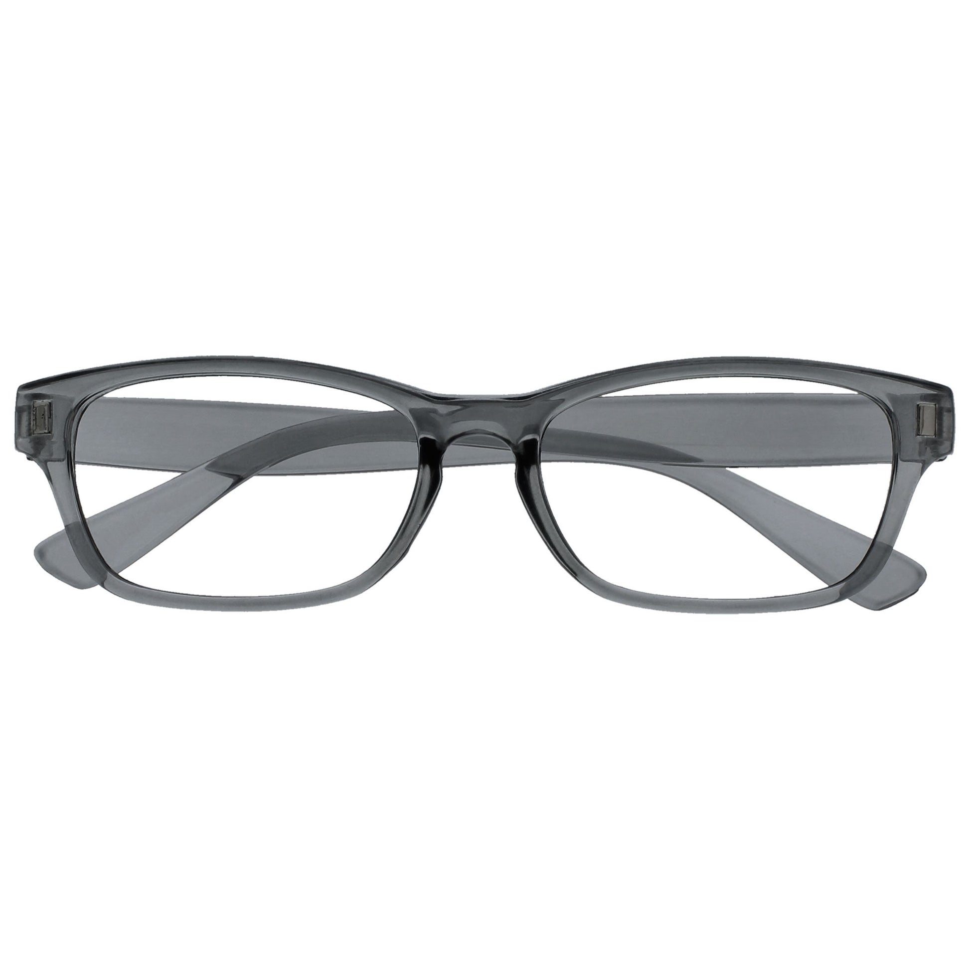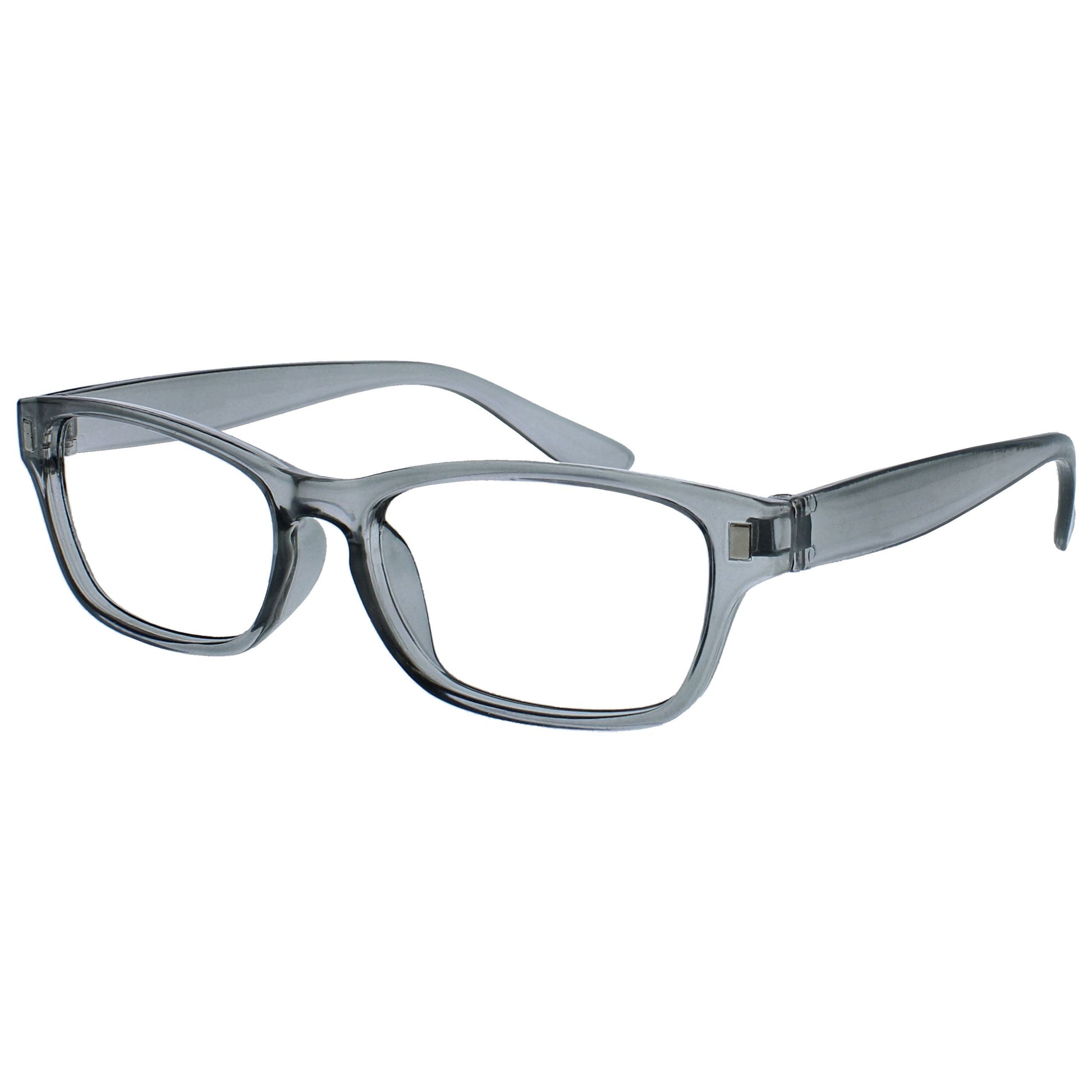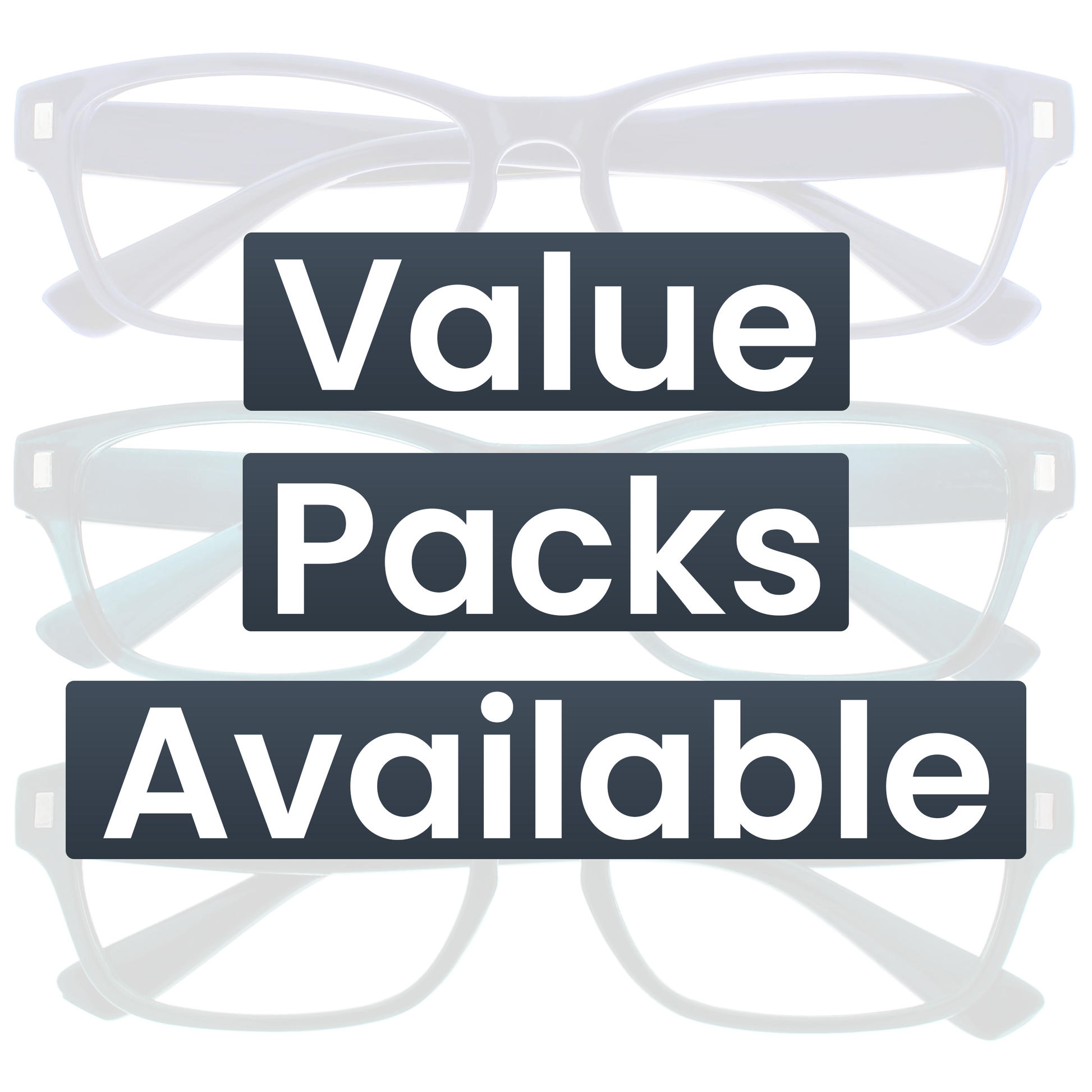 Incredible value Reading Glasses in a square frame in 5 neutral colours, Black, Brown. Blue, Transparent Grey, Turquoise. Many pack variations available. Scratch-resistant lenses. Unisex. Green and Solid Grey discontinued but available in limited strengths.