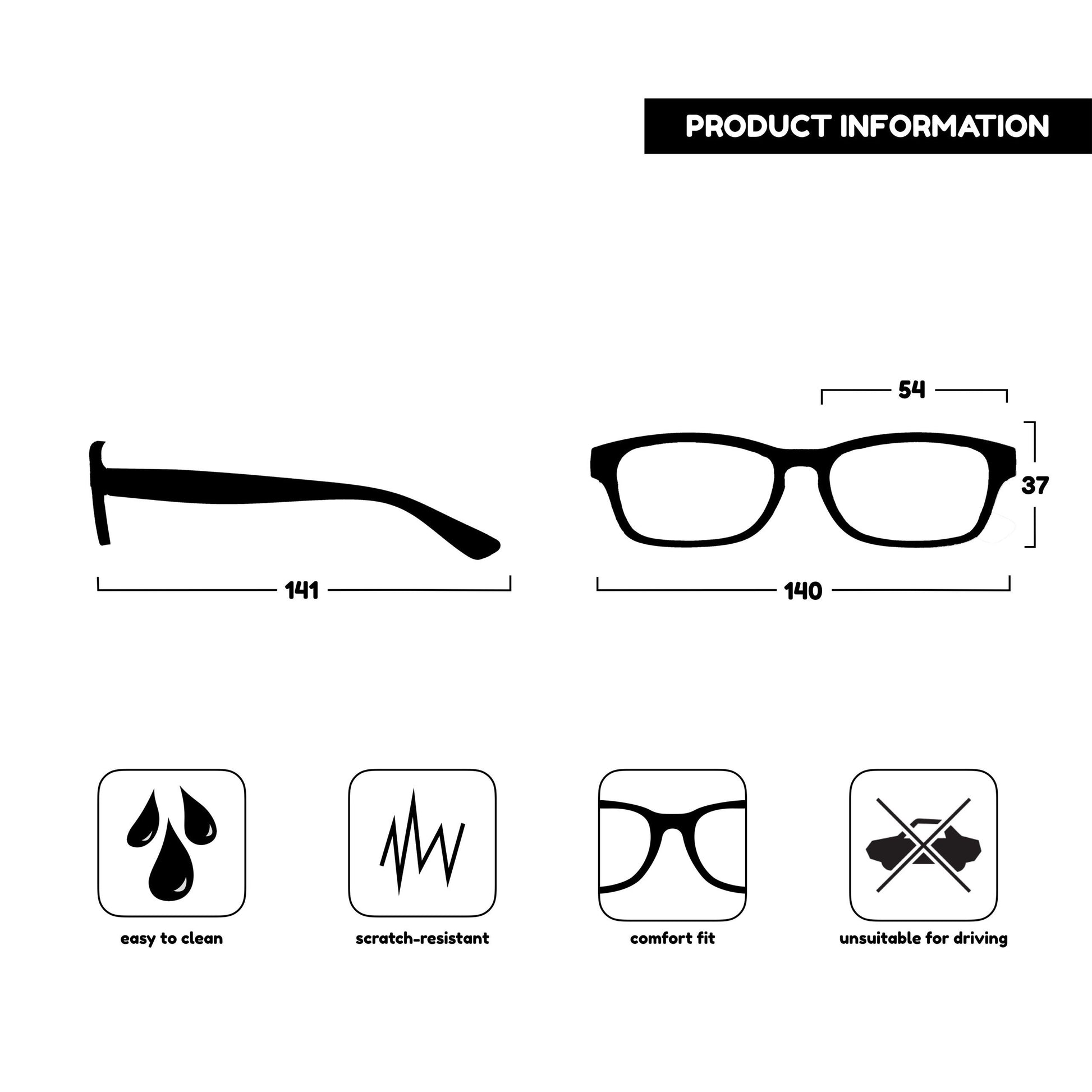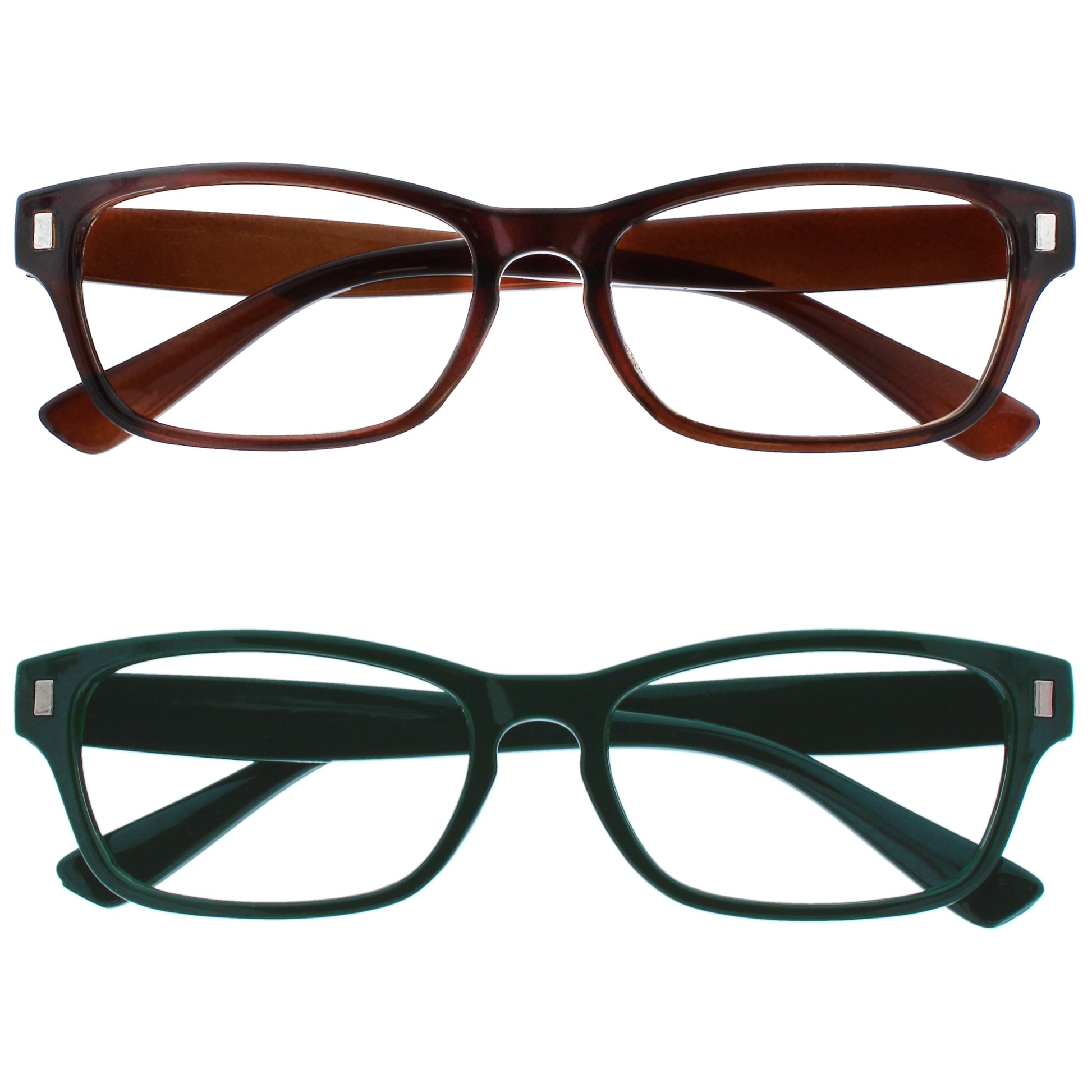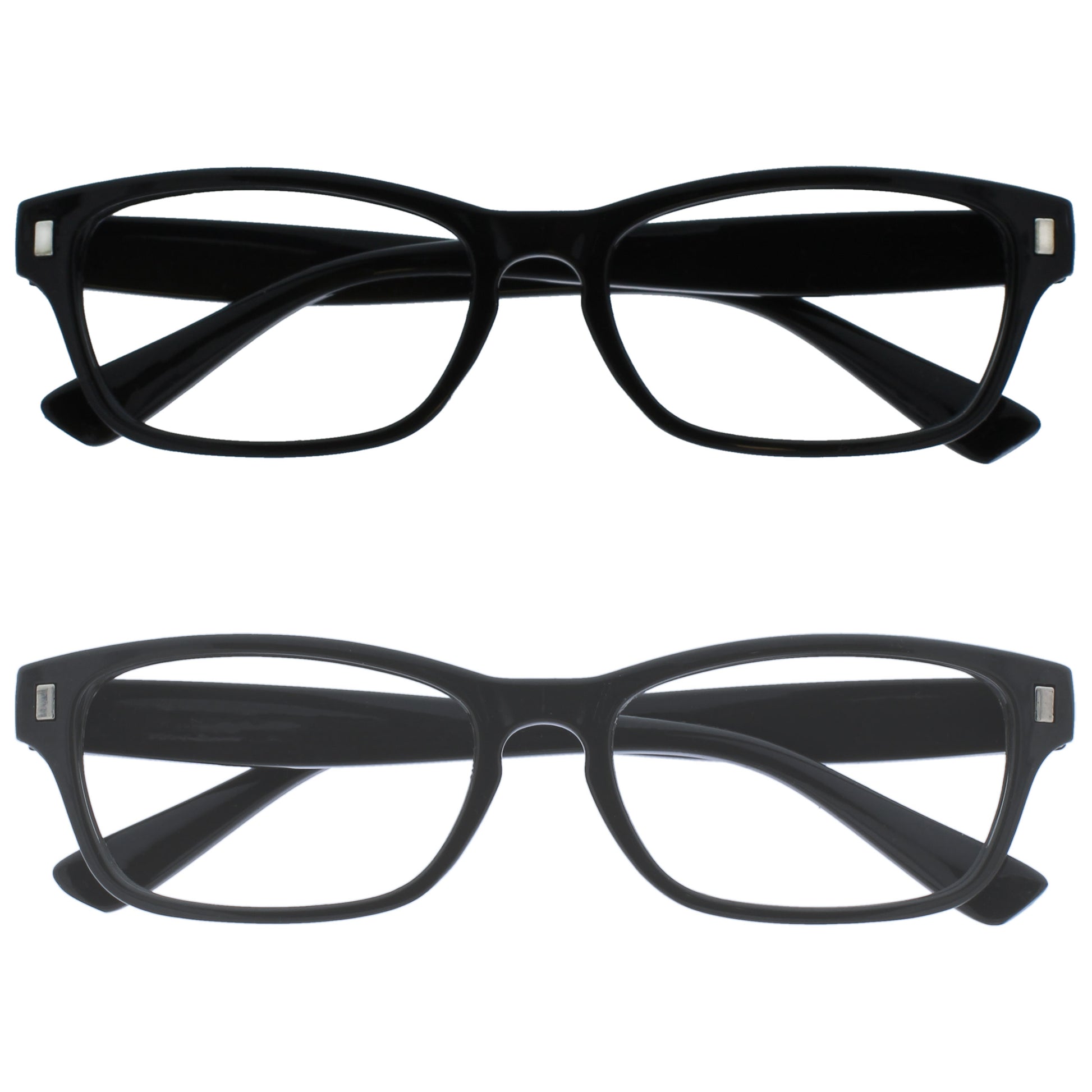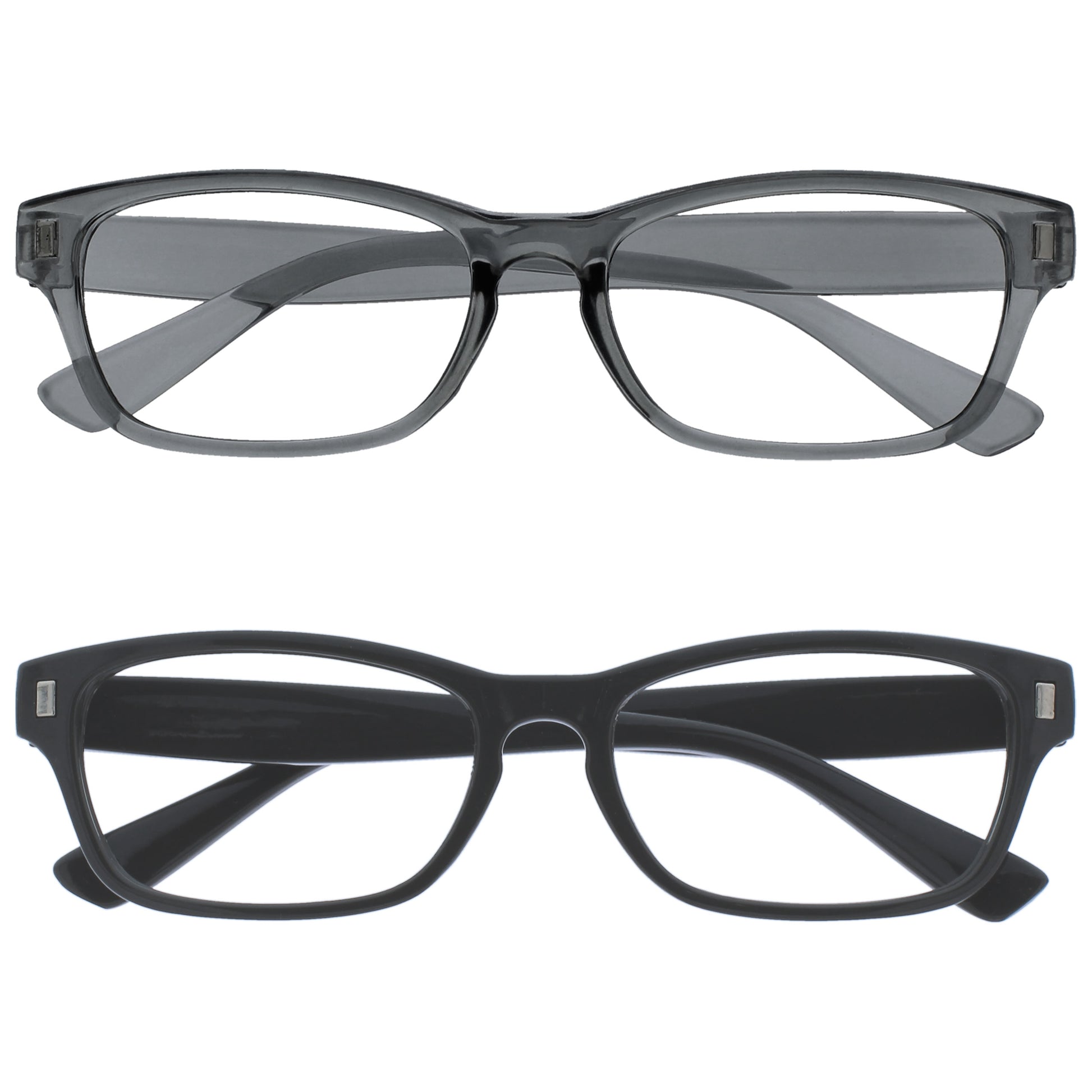 Incredible value Reading Glasses in a square frame in 5 neutral colours, Black, Brown. Blue, Transparent Grey, Turquoise. Many pack variations available. Scratch-resistant lenses. Unisex. Green and Solid Grey discontinued but available in limited strengths.