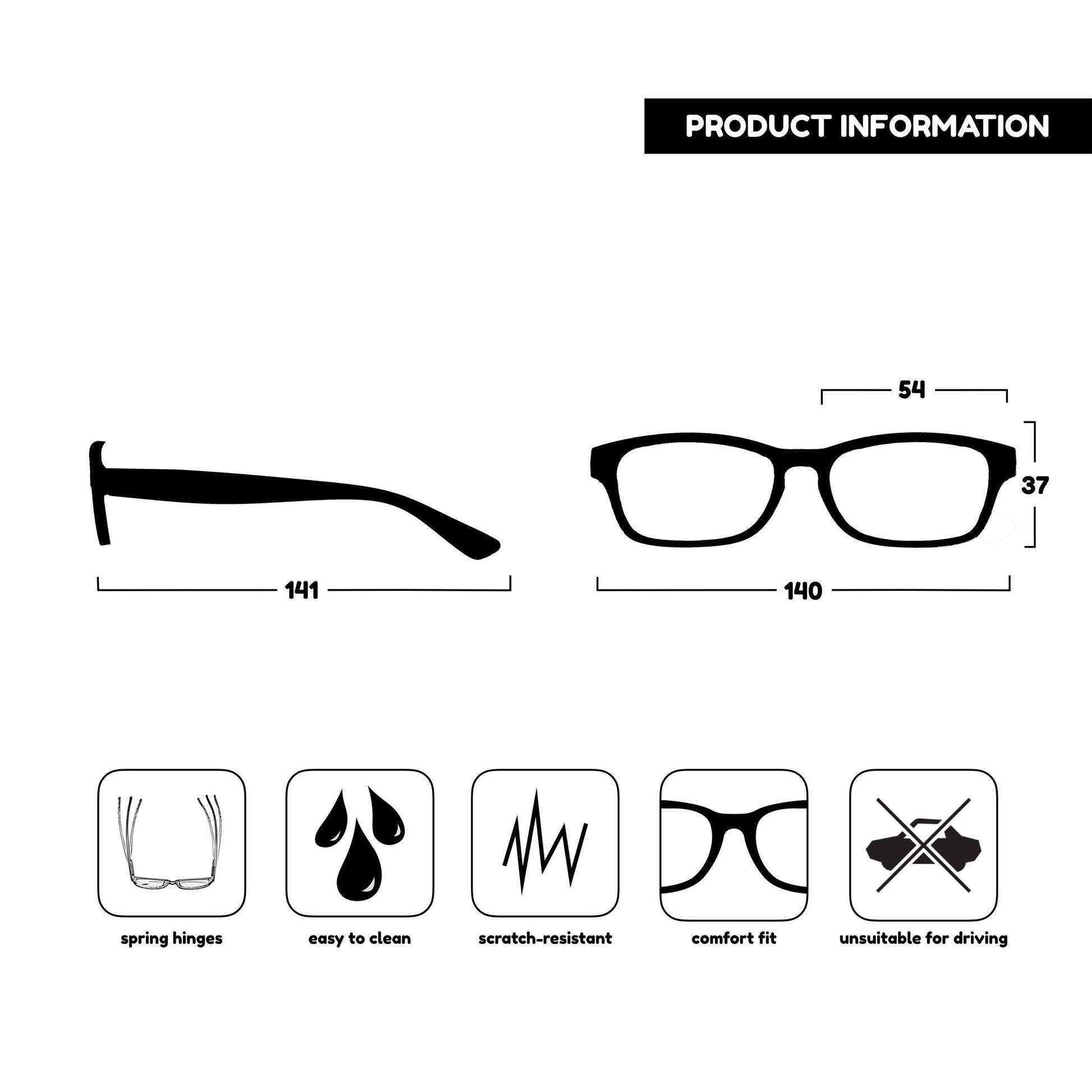 Reading Glasses in this popular Classic 1950's style rectangular frame in 3 tortoiseshell colours. Scratch-resistant lenses and spring hinges for extra comfort. Unisex