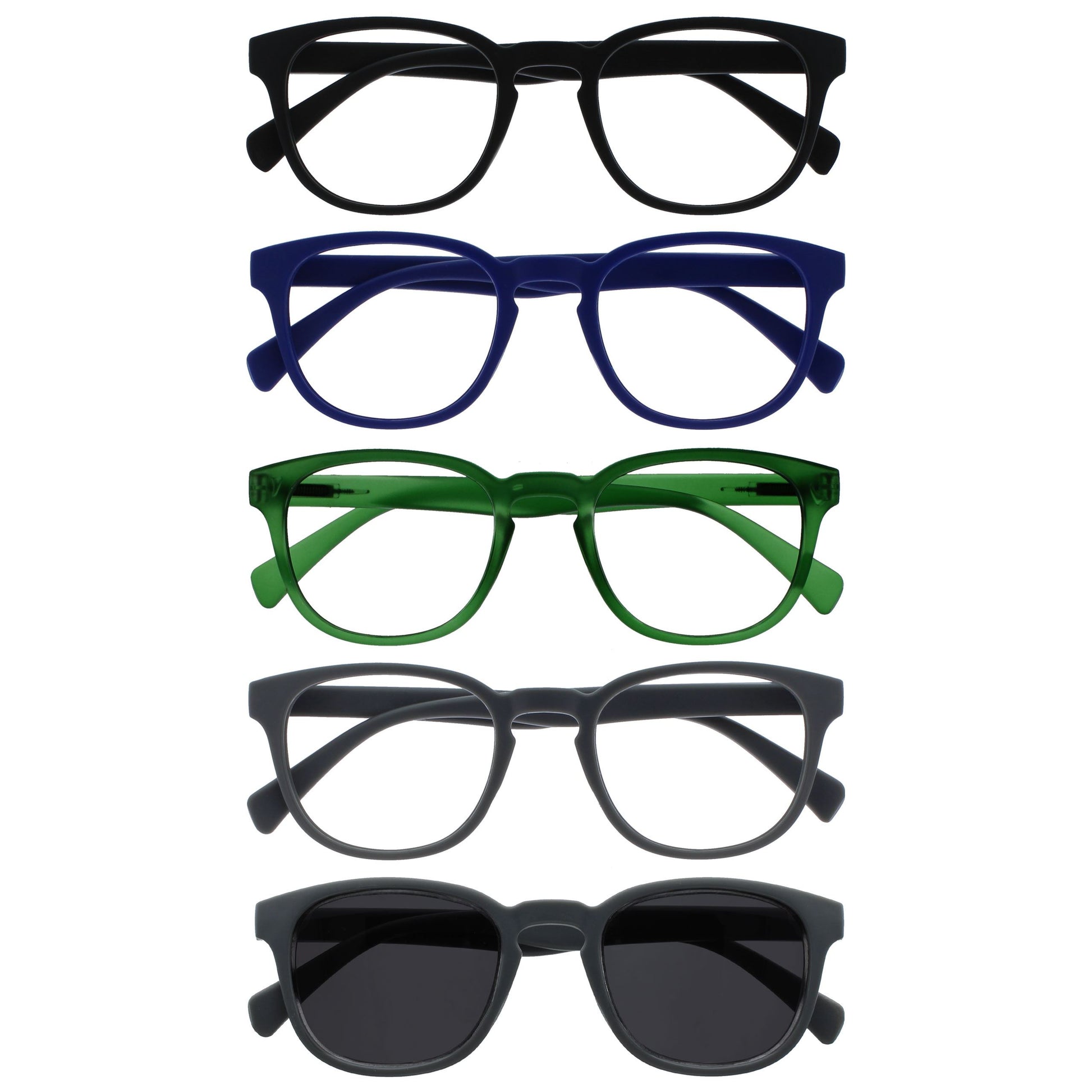 READING SUNGLASSES and READERS (+1.00 to +3.50) multi pack, in a Retro chunky matt light easy to wear frame in matt bold colours. A value 5 pack with scratch-resistant lenses and spring hinges for extra comfort. Unisex. Tinted lenses with UV400 protection.