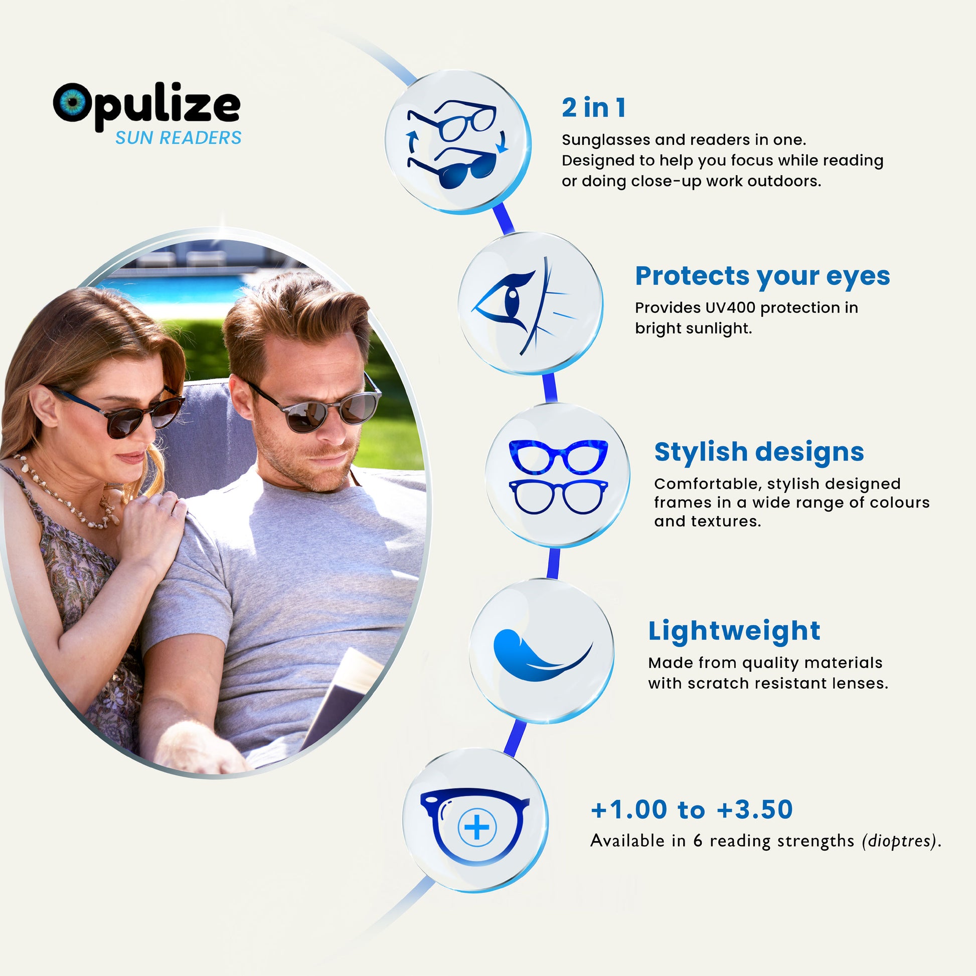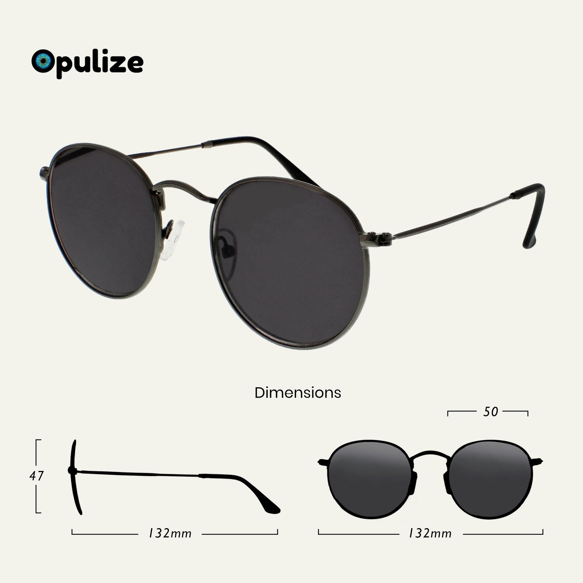 Reading Sunglasses in this popular iconic Retro 60's design frame. Available in gunmetal and shiny gold. Scratch-resistant tinted lens with UV400 protection. Unisex. Opulize felt pouch included.